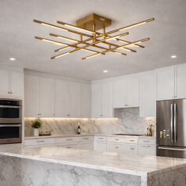 Model LED lustera koji dominira u prostoru, boja zlata, snaga 130W, toplo bela boja svetla, mogućnost dimovanja.