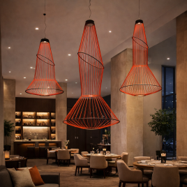 Ekskluzivni LED luster snage 24W i svetlom od 3000K u crvenoj boji, deo Lumé programa, stvara luksuznu i jedinstvenu atmosferu. Idealna je za luksuzne dnevne sobe, restorane i barove koji žele da unesu toplinu, ali i kreativan dizajn i pečat originalnosti u enterijer.