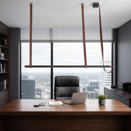 Elegantna linijska visilica, crno rasvetno telo, kaiševi boje kafe, snaga 36W, toplo bela boja svetla.